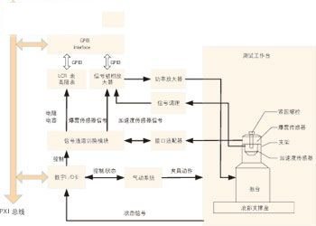 為保證汽車爆震傳感器測試系統(tǒng)的可靠性、高效性和可擴展性,在硬件組成上采用PXI系統(tǒng)實現(xiàn)對整個系統(tǒng)的控制,硬件資源與系統(tǒng)構成如圖2所示,主要包括PXI控制器、PXI數(shù)字I/O板卡、振臺、LCR表、高阻表、信號鎖相放大器、信號通道切換模塊和氣動夾具系統(tǒng)等。