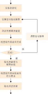壓電式爆震傳感器的線性度檢測主要通過連續(xù)改變振臺的振動頻率,即采用掃頻的方式,將振臺的振動加速度穩(wěn)定在設定范圍內(nèi),對各個頻率下的傳感器靈敏度進行檢測,輸出各個靈敏度與頻率相對應的連續(xù)曲線,并檢測該曲線是否符合該傳感器產(chǎn)品的線性度要求,其測試流程如圖1所示。