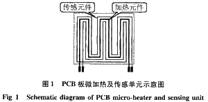 PCR是一種體外模擬自然DNA復(fù)制過程的核酸擴(kuò)增技術(shù)。隨著微機(jī)電系統(tǒng)技術(shù)的興起,一類微反應(yīng)器一集成微反應(yīng)槽PCR芯片使進(jìn)行PCR的設(shè)備平臺面臨革命性的變革。但是,PCR芯片在進(jìn)軍市場的過程中卻遇到了較大的困難,主要原因之一是芯片成本居高不下。為此,本文作者設(shè)計(jì)了一種結(jié)構(gòu)簡化、低成本的PCR芯片,同時(shí),提出了一種新型測控方案,該方案能夠?qū)?20只芯片進(jìn)行溫度控制。為實(shí)現(xiàn)該方案,需要在芯片陣列上方覆蓋一張柔性印刷電路板(printed circuit board,PCB),柔性PCB板與120只PCR芯片靠彈性力均勻接觸。利用PCB板銅箔具有一定阻值,且該阻值與溫度有確切對應(yīng)關(guān)系的原理在柔性PCB板上制作120個(gè)微加熱及傳感單元,微加熱及傳感單元與PCR芯片長、寬幾何尺寸相同。整個(gè)系統(tǒng)由一臺工業(yè)控制計(jì)算機(jī)通過相應(yīng)接口板卡控制。每個(gè)微加熱及傳感單元如圖1所示。