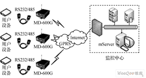 智能無線數(shù)據(jù)終端MD600G可以用于數(shù)據(jù)中心和被監(jiān)控設備間,實現(xiàn)數(shù)據(jù)的遠程透明傳輸。MD600G的內部結構如圖1所示,它有如下特點:
