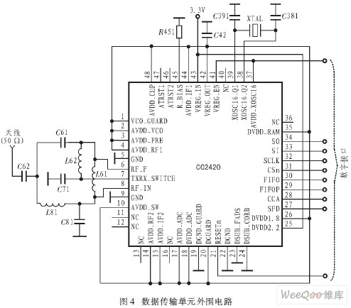 圖4給出數(shù)據(jù)傳輸單元的外圍電路。CC2420只需要極少的外圍元器件。其外圍電路包括晶振時鐘電路、射頻輸入/輸出匹配電路和微控制器接口電路3部分。