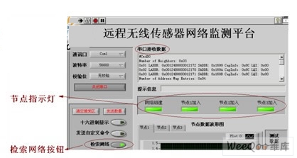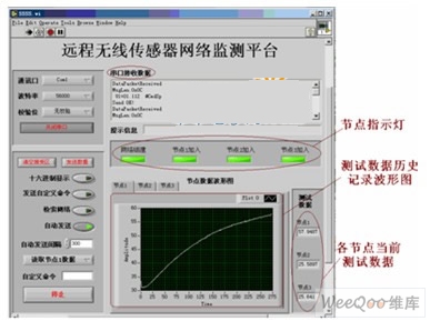 本文在PC機(jī)上利用LabVIEW設(shè)計(jì)實(shí)現(xiàn)了無線傳感器網(wǎng)絡(luò)監(jiān)測(cè)平臺(tái)。觀測(cè)者通過操作此監(jiān)測(cè)平臺(tái),可以方便的觀察無線傳感器網(wǎng)絡(luò)的狀態(tài);并可進(jìn)行對(duì)無線傳感器網(wǎng)絡(luò)的操作,主要包括檢測(cè)無線傳感器網(wǎng)絡(luò)的狀態(tài)、獲取網(wǎng)絡(luò)中傳感器節(jié)點(diǎn)采集的數(shù)據(jù)清晰的觀察無線傳感器網(wǎng)絡(luò)采集的數(shù)據(jù)信息。