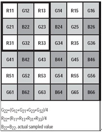 當(dāng)今最流行使用的CFA是Bayer模式,如圖1所示。該方案由Kodak創(chuàng)立,它利用這樣的原理:人眼對(duì)綠色成分的識(shí)別靈敏度大于紅色或藍(lán)色。因此,在Bayer濾光鏡陣列中,通過(guò)綠色濾光鏡的光強(qiáng)是通過(guò)藍(lán)色濾光鏡或紅色濾光鏡的兩倍。這便引出一種通常稱(chēng)作的“4:2:2 RGB”的輸出格式,即每發(fā)送2份紅色光和2份藍(lán)色光就對(duì)應(yīng)發(fā)送4份綠色光。