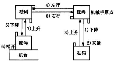 對傳感器加載和卸載壓力是整個檢測過程中必不可少的工作程序.如果使用人工施力和卸力,操作費(fèi)時費(fèi)力,而搬運(yùn)機(jī)械手能模擬人手臂的部分動作,按照設(shè)定的程序?qū)来a進(jìn)行抓取、搬運(yùn)操作,不受砝碼重量的限制,能在短時間內(nèi)自動完成加載和卸載過程.機(jī)械手的移動使用電磁閥驅(qū)動氣缸來實(shí)現(xiàn),其操作是加載時將砝碼搬至傳感器測試機(jī)臺上,卸載時將砝碼搬回原處.搬運(yùn)機(jī)械手加載壓力的工藝流程如圖2,圖中的小方塊代表各個方向的限位開關(guān),當(dāng)機(jī)械手移動時遇到限位開關(guān)停止當(dāng)前的運(yùn)動,進(jìn)行下一步的運(yùn)動.1)~8)是加載壓力過程中搬運(yùn)機(jī)械手的運(yùn)動步驟.卸載壓力過程的機(jī)械手運(yùn)動類似.