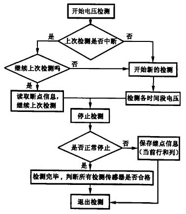 系統(tǒng)對32路數(shù)據(jù)讀取頻率為2.5Hz,讀取10個電壓值的時間為[1/(2.5Hz)]×10=4s.對比傳統(tǒng)檢測方法,該自動檢測系統(tǒng)不但提高了檢測數(shù)據(jù)的精確性,而且將每次的檢測時間從原來的122s縮短到4s,減小了時間誤差.系統(tǒng)還考慮了意外斷電情況,設(shè)置了斷點(diǎn)保護(hù)功能模塊.如意外斷電,續(xù)電后可以繼續(xù)未正常結(jié)束的檢測過程,從斷點(diǎn)處重新開始數(shù)據(jù)采集和檢測.電壓檢測模塊流程設(shè)計如圖4.