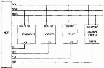 SPI(SerialPeripheralInterface)是MOTOROLA公司推出的一種同步串行外設(shè)接口,允許MCU與各個(gè)廠家生產(chǎn)的標(biāo)準(zhǔn)外圍設(shè)備直接接口,以串口方式交換信息。SPI使用4條線(xiàn):串行時(shí)鐘SCK,主機(jī)輸入\從機(jī)輸出數(shù)據(jù)線(xiàn)MISO(簡(jiǎn)稱(chēng)SO),主機(jī)輸出\從機(jī)輸入數(shù)據(jù)線(xiàn)MOSI(簡(jiǎn)稱(chēng)SI)和低電平有效的從機(jī)選擇線(xiàn)CS。MCU與外設(shè)器件的SCK、MOSI、MISO、都是同各端相連。擴(kuò)展多個(gè)外設(shè)器件時(shí),SPI無(wú)法通過(guò)數(shù)據(jù)線(xiàn)譯碼選擇,故SPI接口的外設(shè)器件都有片選端CS,MCU通過(guò)不同的I/O口線(xiàn)來(lái)分時(shí)選通相應(yīng)外設(shè)器件。設(shè)計(jì)中SS為DataFlash器件的片選信號(hào),TCS為溫度傳感器的片選信號(hào),VCS為多路DA器件的片選信號(hào)。圖3為SPI外設(shè)器件擴(kuò)展電路原理圖。