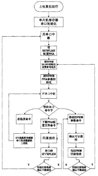 AT89LS8252按照?qǐng)D4的主程序流程圖來(lái)完成邏輯配置和攝像機(jī)的參數(shù)初始化。下面詳細(xì)闡述一下FPGA配置文件下載到DataFlash的程序設(shè)計(jì)。因?yàn)锳T45DB041B的存儲(chǔ)空間為4,325,376bit,完全能夠存儲(chǔ)3,006,496bit的配置文件。
