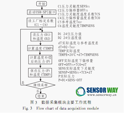 數(shù)據(jù)采集模塊的主要工作流程如圖3所示,啟動數(shù)據(jù)采集后,系統(tǒng)首先通過USB-SPI接口讀取MS5803-01BA的PROM中存放的6個(gè)標(biāo)定參數(shù)C1~C6.然后讀出壓力轉(zhuǎn)換值D1和溫度轉(zhuǎn)換值D2,再算出溫度TEMP和溫度補(bǔ)償后的壓力P,并把溫度TEMP和壓力P寫入文件。如無停止信號,就回頭繼續(xù)采樣。反之,就結(jié)束采樣,等待處理。