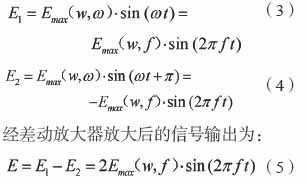 現(xiàn)以電磁速度式信號檢測原理為例說明信號檢測的工作過程。射流振蕩頻率f是由感應電動勢E的周期變化反映的。射流振蕩幅值Emax既是射流腔信號檢測電極幾何位置w的函數(shù),又是射流振蕩頻率f的函數(shù)。計算機數(shù)值模擬結果表明,在相同的管道流速條件下,處于射流腔內部不同位置的振蕩流體,其流動速度是不同的,因此感應電動勢也不相同;當管道中流速變化時,射流振蕩頻率也會隨之改變。射流振蕩頻率越低,射流體切割磁力線的運動速度就越慢,檢測到的信號幅值就越小。反之,頻率越高,速度就越快,信號幅值就越大。信號檢測方式可以是單端形式,也可以是差動形式,差動信號輸出幅值是單端形式的2倍。已知射流體在計量腔中按正弦規(guī)律振蕩,可用下式分別描述兩路相位相反的單端輸出信號E1和E2: