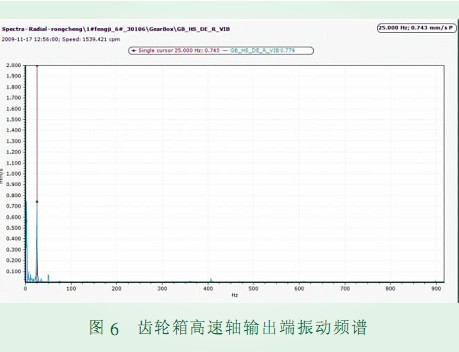 齒輪箱高速軸輸出端振動頻譜見圖6所示。分析振動速度頻譜,發(fā)現(xiàn)有輕微不對中征兆,徑向與軸向均存在較低1倍與2倍峰值,但通過對發(fā)電機(jī)振動的分析,認(rèn)為高速軸不對中征兆是由發(fā)電機(jī)振動引起,需要進(jìn)行后續(xù)跟蹤確認(rèn)。不對中對軸承狀態(tài)影響較大,建議跟蹤查看軸承的振動值趨勢。