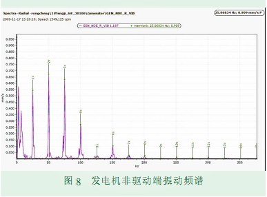 發(fā)電機(jī)非驅(qū)動端振動頻譜見圖8所示。從非驅(qū)動端的振動頻譜來看,存在與驅(qū)動端相同的征兆1-6倍發(fā)電機(jī)轉(zhuǎn)頻處均存在峰值,符合機(jī)械松動的征兆,表明發(fā)電機(jī)驅(qū)動端軸承處存在一定的磨損,為軸磨損或者軸承座磨損。整體振動值處于黃色預(yù)警期,可繼續(xù)運(yùn)行 但要經(jīng)常跟蹤振動變化趨勢,需要定期潤滑維護(hù)。