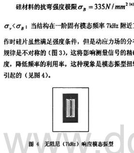 結(jié)構(gòu)在動(dòng)態(tài)條件下工作時(shí),硅片可能產(chǎn)生扭轉(zhuǎn)和翹曲現(xiàn)象,而Von Miss 應(yīng)力是建立在畸變能基礎(chǔ)上,并且考慮帶中間應(yīng)力的影響:因此,用它進(jìn)行動(dòng)強(qiáng)度分析比較合理, 當(dāng)結(jié)構(gòu)在一階固有模態(tài)頻率7KHz附近工作時(shí)硅片雖然滿足強(qiáng)度條件,但是動(dòng)應(yīng)力場的分布規(guī)律是不對稱的圖3 這將影響測量信號的精確度,降低頻率的利用率,這種現(xiàn)象是模態(tài)振型扭轉(zhuǎn)引起的見圖4