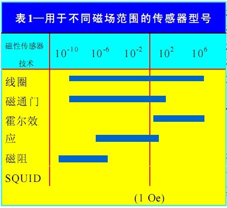 磁場測量可分為三個范圍。在每個范圍中,能在其環(huán)境中處于最佳工作狀態(tài)的磁性傳感器型號也不同。第一個磁場范圍遠大于地球磁場(如在永久磁鐵或大電流附近)。其范圍為 100 奧斯特(Oe) 或更高。第二個磁場范圍約等于地球磁場或0.6 Oe 。第三個磁場范圍遠遠小于地球磁場,它們在 1 mOe 或更低范圍內(nèi)。地球磁場常用作受鐵磁物體干擾的背景磁場,如在磁異態(tài)檢測中的鐵磁物體。表 1 給出了用于不同磁場范圍的傳感器型號 !