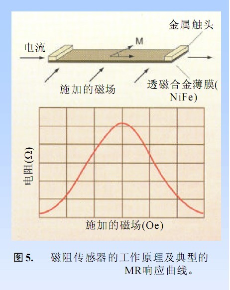 各向異性磁阻(AMR)發(fā)生在鐵質(zhì)材料中。如圖 5 所示, 當(dāng)施加的磁場垂直料中于用鐵質(zhì)材料制成的薄板中的電流時,它本身的電阻明顯有變化。磁阻傳感器傳感沿著空間一個方向的磁場,在此模式范疇內(nèi),它們屬于霍爾效應(yīng)傳感器和SQUID(超導(dǎo)量子干涉裝置之間的傳感器)。 SQUID 可測量小于 1 µOe 幾個數(shù)量級的磁場。磁阻傳感器通常用于測量µOe 到 10Oe 的磁場。