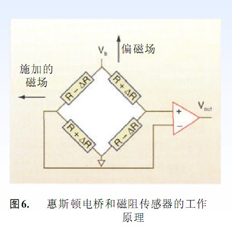 惠斯頓電橋是磁阻傳感器的基礎(chǔ)電氣元件。圖5說明了磁阻傳感器的工作原理和一個MR板對外部磁場的典型響應(yīng)。圖6所示為用四個磁控電阻器制成的惠斯頓電橋帶有一個供電電壓Vb,致使電流通過電阻器。如圖所示,施加一個偏磁場,使在所有電阻中的磁化強度和電流間有一個約45°的夾角。如果電阻器是同一種結(jié)構(gòu),則所有四個電阻器的電阻是相同的,正交施加磁場h的R.A,使兩個反向放置的電阻器磁化而轉(zhuǎn)向電流,使電阻有一個增量△R,在剩下的兩個反向放置的電阻器中,由于磁化而轉(zhuǎn)離電流,導(dǎo)致電阻減少△R 。