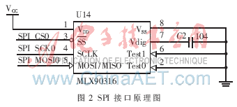 MLX90316具備1路SPI接口,用于角度信號的數(shù)據(jù),由于串行通信的輸出信號直接來自于內(nèi)部DSP輸出,SPI輸出模式更穩(wěn)定,誤差更小,并且具有更高的抗干擾能力,在本設(shè)計(jì)中,選用SPI接口,具體的硬件接口連接電路如圖2所示。在圖2中,MLX90316的SPI 3根線與LPC2136的SPI0口連接。SPI(Serial Protocol Interface)總線接口是一種同步串行外設(shè)接口。這是一個(gè)4根信號線的串行接口協(xié)議,包括主、從兩種模式。這4根信號線分別是:時(shí)鐘線(SCK)、數(shù)據(jù)輸入線(MISO)、數(shù)據(jù)輸出線(MOSI)和從設(shè)備使能線(/SS)。
