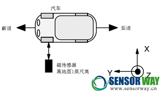 對(duì)于車(chē)輛方向與類(lèi)型檢測(cè),可以將磁傳感器放置在路邊,也可以埋在地底。沿著被檢測(cè)的車(chē)道即可。三軸磁傳感器X、Y、Z軸方向定義如圖2所示。