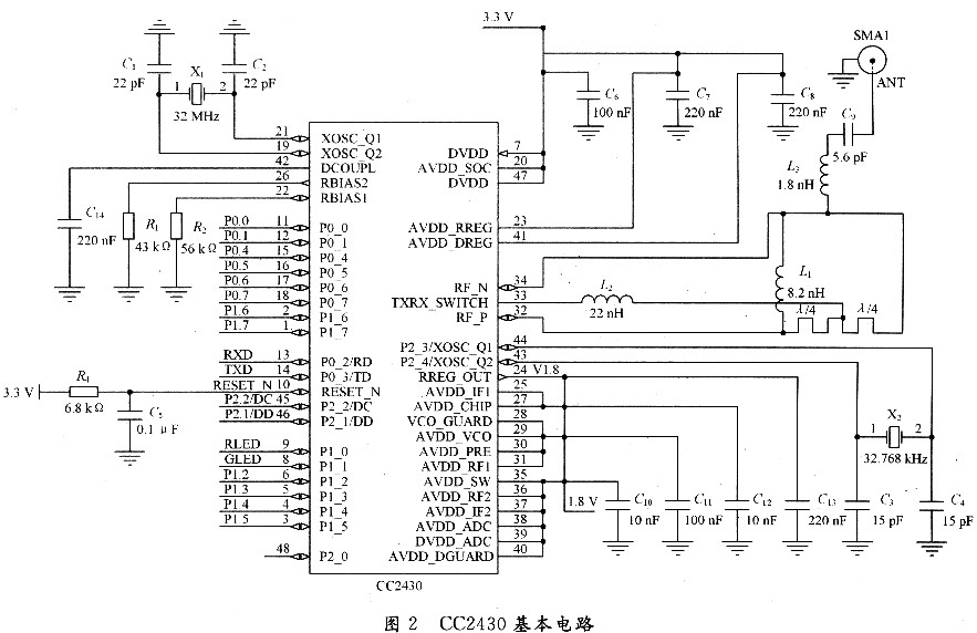 CC2430是Chipcon公司推出的用來(lái)實(shí)現(xiàn)嵌入式ZigBee應(yīng)用的片上系統(tǒng)。CC2430只需要很少的外接元件就可以運(yùn)行,其內(nèi)部已集成了大量必要的電路,因此采用較少的外圍電路即實(shí)現(xiàn)信號(hào)的收發(fā)功能。圖2為CC2430基本電路設(shè)計(jì)。