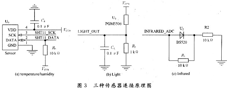 CC2430與溫濕度傳感器SHTll,光照度傳感器PGM5506,紅外傳感器BS520連接原理圖如圖3所示,其中P0.O,P0.1,P0.6,P1.2和P1.3為CC2430的I/O端口。