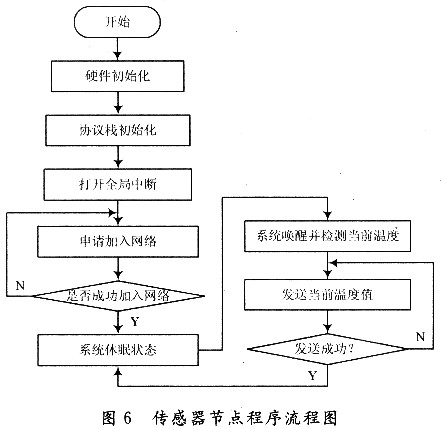 傳感器節(jié)點(diǎn)程序流程圖如圖6所示,程序同樣首先初始化CC2430,之后初始化協(xié)議棧,并打開(kāi)全局中斷。開(kāi)始發(fā)送加入網(wǎng)絡(luò)信號(hào),等待協(xié)調(diào)器響應(yīng),如果加入網(wǎng)絡(luò)成功,傳感器進(jìn)入休眠狀態(tài),如果不成功就繼續(xù)申請(qǐng)加入網(wǎng)絡(luò)。加入網(wǎng)絡(luò)成功之后,溫濕度采集節(jié)點(diǎn)就定時(shí)采集數(shù)據(jù)并向協(xié)調(diào)器發(fā)送,如果發(fā)送成功,系統(tǒng)進(jìn)入休眠狀態(tài),如果發(fā)送失敗,繼續(xù)發(fā)送當(dāng)前溫度值。