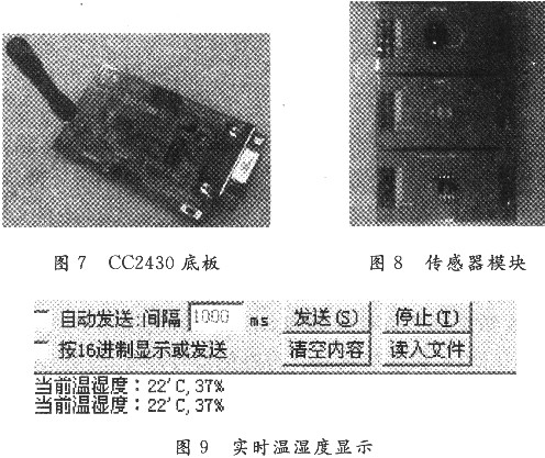 系統(tǒng)的各個(gè)節(jié)點(diǎn)硬件采用模塊化設(shè)計(jì),CC2430底板模塊實(shí)物如圖7所示,傳感器模塊如圖8所示。在天氣晴朗空曠的地方,測(cè)得ZigBee節(jié)點(diǎn)之間的傳輸距離能達(dá)到50~70 m,工作在室內(nèi)條件下有效傳輸距離能達(dá)到30 m左右。通過(guò)主機(jī)上的串口收發(fā)軟件監(jiān)視采集到的實(shí)時(shí)溫度信息,能夠很好地實(shí)現(xiàn)溫度信息的讀取。監(jiān)視到的溫度如圖9所示。