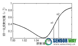 圖2:強(qiáng)度型表面等離子共振(SPR)反射光強(qiáng)隨折射率變化圖