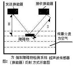 倒車撿測(cè)障礙糸統(tǒng)超聲換能器的工作方式為反射式,,即發(fā)送傳感器換能器發(fā)射40KHz頻率的超聲波,迂到障礙后反射被接收傳感器的換能器接收并轉(zhuǎn)換成電信號(hào),見圖2所示. 其傳播介質(zhì)為空氣.