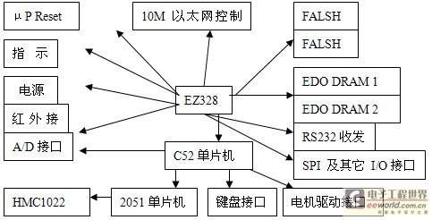 本文的課題背景是一個機器人玩具的控制系統(tǒng)設計,主芯片采用的是以摩特羅拉公司的MC86EZ328芯片,只完成與通信、運算等有關的主要操作,在沒有操作時,由運行于其上的操作系統(tǒng)uClinux來維護。對于所有與EZ328的核心運算、控制、通信、操作無關的外圍設備的維護和控制都通過一塊AT89C52來完成,它與EZ328的底層通信協(xié)議為同步串口協(xié)議(SPI),在AT89C52中由軟件來實現。C52包含的部件主要是A/D轉換器,鍵盤接口,電機驅動模塊。硬件結構電路圖如下圖1: