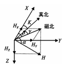 HMC的輸出電壓為磁場強度為0時傳感器的輸出。所以當U0為0時, Uout正比于磁場強度B。如圖4,假設機器人處于水平面上,X為機器人行進方向,Y為水平面上垂直X的方向向右(即X順時針轉90),地里北極方向和地磁北極方向如圖所示。H為地磁場,Hx、Hy分別是H在X、Y方向的水平分量, β為機器人行進方向和地磁北極方向的夾角, γ為地磁北極和地理北極方向的夾角,K就是機器人行進方向與地理北極方向之間的夾角,也就是我們最終要求的角度。(此處的β、γ、 K都是由前者出發(fā)順時針到達后者的角度)由圖可明顯看出,K= β-γ。而在地球上不同方位的γ可查表得出,所以關鍵就是求得 。由磁阻傳感器可以得出Hx、Hy,(此處忽略了機器人在Z軸方向的傾斜,所以二維傳感器就夠用了),