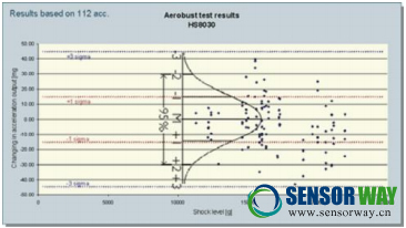 Colibrys HS8030.D在沖擊后表現(xiàn)出優(yōu)良的穩(wěn)定性,偏離最大不超過15mg ,比例因子偏差小于1200ppm。