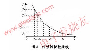 溫度變化給傳感器實(shí)際測量帶來誤差,表現(xiàn)在傳感器的輸入輸出特性曲線上產(chǎn)生非線性變化。為解決這樣問題,必須使問題簡單化,找出它們間的關(guān)系,建立對應(yīng)的數(shù)學(xué)模型。傳感器特性曲線y=f(x),如圖2所示。