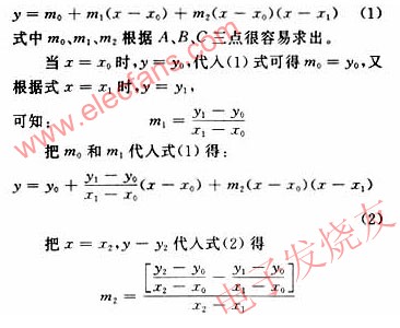 若傳感器的輸入和輸出之間的特性曲線的斜率變化很大,采用線性插值法,誤差就很大,這時(shí)可采用二次曲線插值法,即通過曲線上3個(gè)點(diǎn)A(x0、y0),B(x1、y1),C(x2、y2)做一拋物線,用此曲線代替原來的曲線,如圖3所示。曲線方程為一元二次方程,一般形式為: