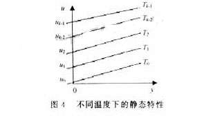 首先給定K個(gè)溫度值(T0,T1,T2,…,TK-1),測出每個(gè)溫度點(diǎn)上傳感器靜態(tài)特性曲線在u 軸上的截距(u0,u1,…,uK),每個(gè)溫度點(diǎn)上傳感器特性曲線的數(shù)據(jù)要精確,必要時(shí)應(yīng)在恒溫箱內(nèi)進(jìn)行,這需要較大的工作量,如圖4所示。