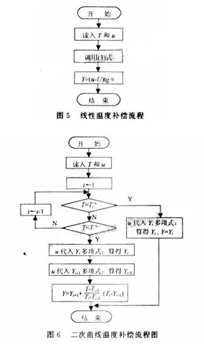 式中U是溫度直線在坐標(biāo)上的截距,可用線性插值由輸入的T求得,α是溫度直線與縱坐標(biāo)軸u的夾角。按圖5流程編制補(bǔ)償程序,并作為子程序與監(jiān)控程序一并使用,以便采集數(shù)據(jù)時(shí)按流程圖自動溫度補(bǔ)償。