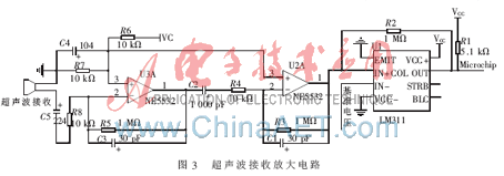 超聲波在空氣中傳播的衰減程度隨傳播距離的增加而增大,所以反射回來被接收頭收到的信號非常微弱,不能直接送入后級電路處理,首先要經(jīng)過信號放大。超聲波接收放大電路如圖3所示[6]。