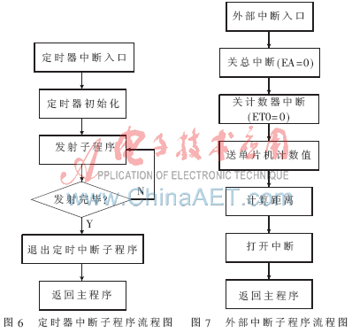 超聲波發(fā)射子程序的作用是通過P1.2口在定時器的設(shè)定時刻取反交替產(chǎn)生寬度為12 μs的高低電平輸出方波脈沖。定時器中斷程序[9]流程如圖6。外部中斷程序流程如圖7。