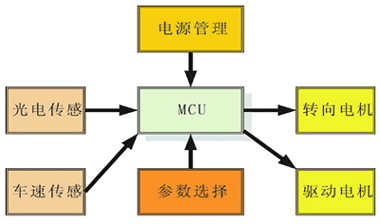 智能車的工作模式是:光電傳感器探測賽道信息,轉(zhuǎn)速傳感器檢測當前車速,電池電壓監(jiān)測電路檢測電池電壓,并將這些信息輸入單片機進行處理。通過控制算法對賽車發(fā)出控制命令,通過轉(zhuǎn)向舵機和驅(qū)動電機對賽車的運動軌跡和速度進行實時控制。