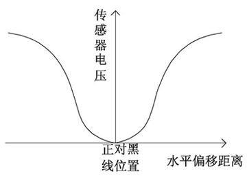 模擬式光電傳感器從理論上可以大大提高路徑探測精度。模擬式光電傳感器的發(fā)光和接收都是錐角一定的圓錐形空間,其電壓大小與傳感器距離黑色路徑標記線的水 平距離有定量關(guān)系:離黑線越近,電壓越低,離黑線越遠,則電壓越高(具體的對應關(guān)系與光電管型號以及離地高度有關(guān)),如圖2所示。