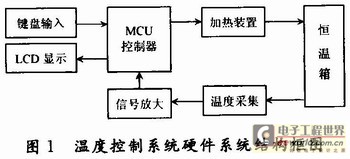 用放置在腔體內(nèi)的溫度傳感器測量恒溫箱內(nèi)的溫度,產(chǎn)生的信號經(jīng)過放大后輸出反饋信號,再用單片機進行采樣,由液晶顯示恒溫箱內(nèi)的溫度,并通過溫度控制算法控制加熱裝置。所使用的單片機為STCl25408AD,自帶A/D轉換、EPROM功能,內(nèi)部集成MAX810專用復位電路(外部晶振20 MHz以下時,可省外部復位電路),ISP(在系統(tǒng)可編程)/IAP(在應用可編程),無需專用編程器可通過串口(P3.0/P3.1)直接下載用戶程序,數(shù)秒即可完成一片。硬件結構框圖如圖1所示。