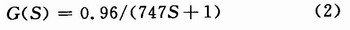式中:△M為系統(tǒng)階躍輸入;△C為系統(tǒng)的輸出響應;t0o.28為對象上升曲線為O.28△C時的時間(單位:min);t0.632為對象上升曲線為O.632△C時的時間(單位:min);從而求得K=O.96,t’=747 s。所以恒溫箱模型為: