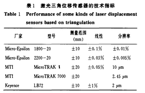 目前國內(nèi)外有很多公司都有這方面的產(chǎn)品,直射式有Keyence生產(chǎn)的LC系列和LB系列,德國 Micro-Epsilon 公司的 optoNCDT系列,美國MTI 公司的MicroTRAK系列等多種型號(hào);斜射式激光 位移傳感器有日本Keyence公司的LD系列。表1 列出了目前市場(chǎng)上常見的幾種激光三角位移傳感 器的技術(shù)指標(biāo)。