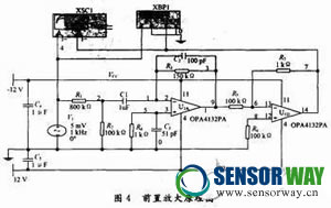 電路中集成運(yùn)放選擇也十分重要。對其輸入電阻、開環(huán)增益、轉(zhuǎn)換速率和增益帶寬、噪聲電壓都有較高要求。較大的開環(huán)增益和增益帶寬,極快的電壓轉(zhuǎn)換速率和極小的等效噪聲帶寬,是非常理想的前置放大用集成電路。本文在電路中選擇OPA132的四運(yùn)放形式OPA4132,它大大減小了電路體積與配置的復(fù)雜程度,降低了噪聲引入。