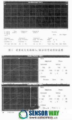 搭建仿真電路,并用仿真軟件Multisim 10中兩通道示波器、波特圖示儀對設(shè)計(jì)的前置放大器分別仿真,得到如圖5所示仿真結(jié)果。從圖5可以看出,經(jīng)過前置放大電路后輸出信號相比輸入信號放大了約2×103倍,且基本無失真。