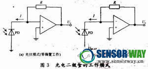 光電二極管一般有兩種模式工作:零偏置工作和反偏置工作,圖3所示為光電二極管兩種模式的偏置電路。