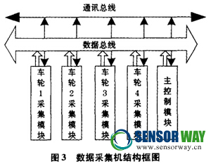 4個(gè)獨(dú)立的CAN-BUS采集模塊作為從機(jī),對(duì)應(yīng)于4個(gè)WFT車輪,各自獨(dú)立完成對(duì)一個(gè)車輪力傳感器數(shù)據(jù)的高速采 集;主控制模塊通過(guò)通訊總線控制協(xié)調(diào)各從模塊,通過(guò)數(shù)據(jù)總 線收集各從模塊采集到的數(shù)據(jù)。