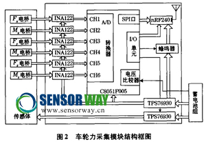 電路系統(tǒng)分為2部分:車輪力采集模塊、車輪力傳送模塊 和數(shù)據(jù)采集機(jī)。