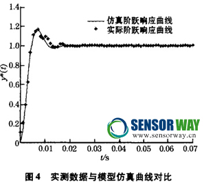 對(duì)辨識(shí)得到的傳感器模型進(jìn)行仿真,得到了辨識(shí)模型的仿 真曲線,如圖4中的連續(xù)線所示。由仿真結(jié)果與實(shí)際響應(yīng)曲線的對(duì)比可以看出,理論模型與實(shí)際特性基本吻合。