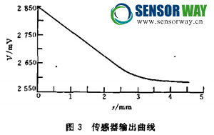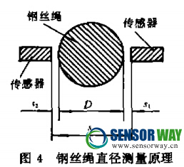 圖3給出了傳感器輸出曲線,實驗研究與理論計算表明,該傳感器在0~3mm范圍內(nèi)有較好的線性度,靈敏度可以達(dá)到0.01mm。采用上述設(shè)計的傳感器可以實現(xiàn)非接觸的位移測量,若成對布置傳感器,如圖4所示,可實現(xiàn) 銦管、鋼棒、鋼絲繩等細(xì)長導(dǎo)磁構(gòu)件直徑的非接觸的動態(tài)連續(xù)測量,由圖4可知,被測物體的直徑 ^與其他方法相比,采用該方法測量 的顯著優(yōu)點是不受被測構(gòu)件表面油泥等非導(dǎo)磁污 物的影響,傳感器的抗干擾性能好與抗沖擊能 力強(qiáng),結(jié)構(gòu)簡單.結(jié)果表明:考慮到偏心等其他干 擾因素的彩響,采用傳感器設(shè)計的鋼絲繩直徑檢 測儀對銀絲繩的動態(tài)測量精度可以達(dá)到0.3mm.