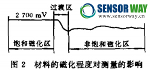由上述分析可知,該傳感器適用于被測物體 是鐵磁構(gòu)件(即能夠改變磁力線分布的物體)間 、的位移的測量.圖2給出了當(dāng)材料磁化到飽和與圖2材料的礅化程度對測量的影響 非飽和狀態(tài)的測量曲線,由于磁場分布受材料特 性影響很大,當(dāng)材料磁化到飽和狀態(tài)時,測量曲線 較為平直;當(dāng)材料未磁化到飽和狀態(tài)時,測量曲線 波動較大;在飽和磁化區(qū)與未飽和磁化區(qū)之間,測量曲線呈上升趨勢,所以為保證測量梢度,被測物體局部應(yīng)該磁化到飽和狀態(tài)。