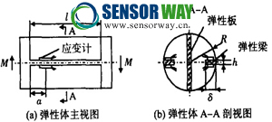 通常的薄壁圓筒型彈性體雖然有較好的剛度 , 但其測(cè)量小量程扭矩的靈敏度較低。本文采用的是一板兩桿式結(jié)構(gòu),如圖1所示。這樣,可以把扭矩的測(cè)量轉(zhuǎn)換為彎矩的測(cè)量 ,從而可以獲得較大的應(yīng)變。同時(shí),這種結(jié)構(gòu)也減少了在豎直方向上力對(duì)其主應(yīng)變的影響,維間耦合小 。